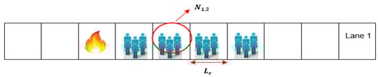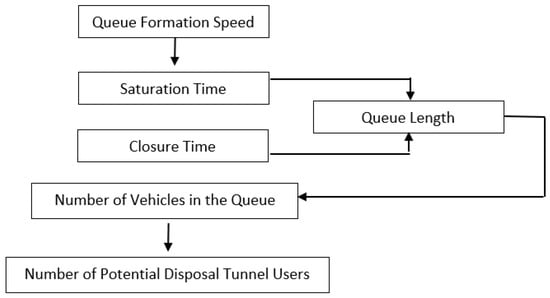 The main output of the queue formation model of the LBAQRAMo is the estimation of the number of vehicles queueing in each lane. Traffic is divided into three categories; free flow, congested, and stoppage. Since the average peak traffic density, percentage, and type of vehicles are not uniform between various lanes in a multi-lane tunnel, in the first stage, the total traffic flow of the tunnel under study is divided between the left and right lanes in two-lane tunnels and between shoulder, middle, and median lanes in three-lane tunnels. Saad Yousif and his colleagues [] studied the distribution of traffic flow among the available number of lanes and modelled lane utilization. They studied a relatively large dataset which was more representative of current lane utilization on United Kingdom motorways. Therefore, their model was utilized in this model in the absence of tunnel-related information to estimate the lane utilization factor for each lane based on the total traffic flow of vehicles (veh/h) in two-lane and three-lane tunnels. The composition of different types of vehicles must also be determined at this stage. Then, the closure time of the tunnel () was calculated based on the basic value of the closure time, which is 120 s in this model, and all fire safety measures influencing it.