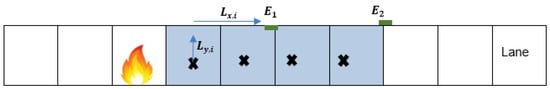 The horizontal travel distance depends on the distance between each group of users (each cell) and the nearest emergency exit to them. The vertical travel distance depends on the tunnel width and the lane which is studied. Figure 3 shows an illustration of the  from the centre of the first cell to the closest emergency exit, where the longitudinal  and lateral  contributions are shown.