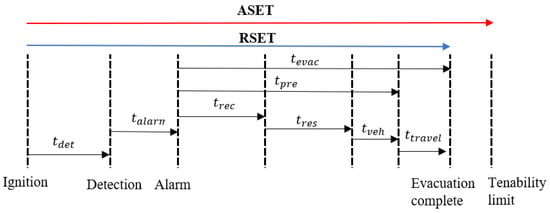 A timeline model is used for the egress model, which describes the sequence of events as a list of continuous phases. A four-stage evacuation process was considered. The first stage is detection which depends on the safety equipment in the tunnel. The second stage is the alarm stage which is the time between detection and the time when the alarm system is activated. The third stage is the pre-movement stage including recognition time, response time, and the time to exit the vehicle. The last stage is traveling which depends on the movement speed and the distance to the emergency exit. Figure 4 illustrates the stages of the evacuation process. The total time of these stages defines the required safe escape time (RSET).