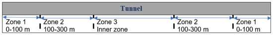 Recognition time consists of a period between the activation of the alarm system and when occupants recognize the danger. The process of calculating the recognition time starts with calculating the basic recognition time, which is influenced by the distance users have from the accident and the severity of the fire. As a result, the basic recognition time will decrease for more severe accidents and consequently, people become aware of the threatening situation within a shorter time. Moreover, the basic recognition time depends on the distance occupants have from the accident as the closer you are to the accident, the sooner you will notice the accident. Considering the distance to the fire location, the area in the vicinity of the accident was divided into three zones first. Zone 1 is from where the accident happened to 150 m down the queue. Zone 2 spans from 150 m to 300 m down the queue and Zone 3 extends from 300 m to the tunnel entrance. Table 2 represents the recognition time allocated to each zone [].