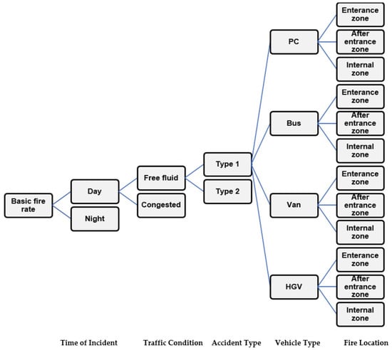 The frequency of defined accident scenarios was calculated via an event tree. The first column of the frequency event tree is initial fire frequency which has been obtained from the historical statics of fire incidents in UK road tunnels. Then, the influence of tunnel length, location, traffic volume, and gradient on the basic fire rate was considered to derive the fire rate for a specific tunnel. The second column of the frequency event tree is “The Time of the Incidents”. Since the fire rate is different in day and night, the influence of time on accidents should be considered in the frequency analysis. The data from UK roads have been used for the effect of time as the data from UK road tunnels were not ready at the time of drafting this paper. The third column of the frequency event tree is “Traffic Condition”. As the fire rate is varied by traffic condition, the effect of traffic condition on fire rate was considered by considering the congested hours of the tunnel under study. Two types of fire incidents were considered in this model. Incidents that include 1 vehicle are Type 1 and collisions that include more than 1 vehicle are Type 2. The probability of type 1 and 2 incidents are derived from UK road data.
