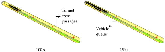 In recent years, various computer models, such as computational fluid dynamic (CFD) models and zone models, have been used to simulate specific characteristics of tunnel fire, such as its heat release rate (HRR) and smoke and their effects, and the evacuation of people in the tunnel. A numerical simulation of a tunnel equipped with jet fans was carried out by [] to assess the safe evacuation. Based on their study under controlled ventilation, the evacuation time was prolonged as the flow of smoke could be controlled. The evacuation process in a tunnel under the contraflow condition was studied by []. Traffic and passenger conditions are based on real data from a tunnel in the UK. Simulation results indicate that all evacuees can survive before the combustion gases and heat influence their survivability when a realistic worst-case fire scenario is modeled without longitudinal ventilation in the tunnel under study.