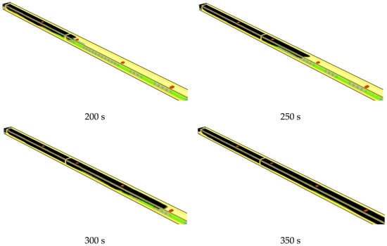 Three-dimensional simulation of fire spread for a fire scenario with 158 MW fire size, 3.5 m/s ventilation velocity, and stoppage traffic.
