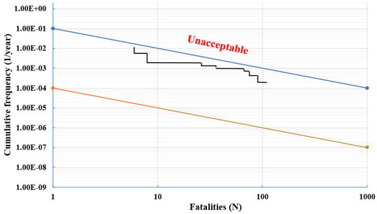 F/N curves of societal risk are provided with the results of quantitative consequence analysis and quantitative frequency analysis. Risk acceptance is obtained using the ALARP criterion in the UK.