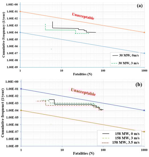 Figure 10 shows the F/N curve for ventilation velocities 0 m/s and 3 m/s for bus fire scenarios (a) and 0 m/s, 3 m/s, and 3.5 m/s for HGV fire scenarios (b). In these 34 scenarios, the tunnel can be considered safe. Although the F/N curve of 3 m/s scenarios is lower than 0 m/s scenarios for bus fire scenarios, which indicates the positive effect of the ventilation system, there is no significant difference between 0 m/s, 3 m/s, and 3.5 m/s HGV fire scenarios.