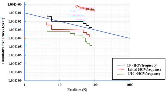 To study the influence of fire incident frequency involving HGV, the frequency of related scenarios, which are 158 MW fire incidents, is decreased and increased by a factor of 10. These frequencies, 1/10× HGV and 10× HGV, respectively lead to lower and higher cumulative frequencies and lower and higher FN curves, compared to initial FN curves of the same scenarios (without ventilation) (Figure 11). These results explain that the frequency of occurrence of each scenario depends directly on the value of the incidental frequencies.