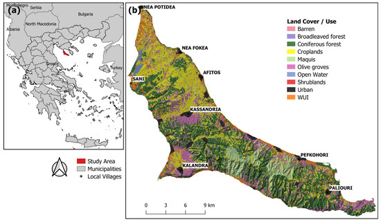 (a) Location map of Kassandra (in red) and (b) land cover types of the Kassandra peninsula along with major urban communities.