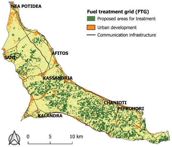 In the northern part of the peninsula, an area of wetlands and forests that covers 40 ha is included in the category “Special Protection Areas” (SPA) and belongs to the European Natura 2000 Network with the code GR1270013 (H.P. 37338/1807/E.103/6.9.2010, Government Gazette 1495B′). According to the Council Directive 92/43/ECC of 21 May 1992 on habitats (European Union Law), approved management plans in Natura 2000 areas presuppose that the interventions do not have negative impacts on the ecological integrity of the site. In many cases, the management of the protected areas requires relevant resolutions by the Greek Ministry of the Environment with implementations of the corresponding compensatory measures. As the negative consequences of the interventions were not identified by this research, we excluded all Natura 2000 sites from receiving fuel treatments (Figure A1c).