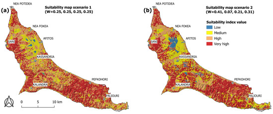 Intermediate suitability map for fuel treatments allocation considering (a) the same weights (W = 0.25, 0.25, 0.25, 0.25) and (b) calculated factor weights (W = 0.41, 0.07, 0.21, 0.31) for the four non-exclusionary criteria.