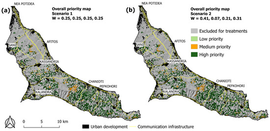 The two final overall priority maps (Figure 6) resulted from the multiplication of the exclusion area map (Figure 4) with the corresponding intermediate suitability layer of each scenario (Figure 5), identifying areas that maximize the levels of achievement of multiple criteria to protect the residentially developed areas and receiving a range of values from 0 to 100. This rating classified the study area into four classes: “excluded for treatments” (value = 0), “low treatment priority” (values between 1 and 30), “medium treatment priority” (values between 31 and 50), and “high treatment priority” (values between 51 and 100) (Figure 6a,b).