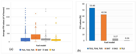 Average FTH values inside the pixels selected for fuel treatments showed different distributions between the four major forest types. The values of FTH for all the four major forest types fell within the lower end of the range, and extreme values were recorded outside the whiskers, which means that the four distributions were not symmetrical (Figure 9a). Thus, most values were not close to the average value of the distribution, so the average number of structures exposed cannot be predicted considering the fire ignition’s land cover type. However, the four distributions differed significantly. A wildfire could potentially expose more structures when initiated from the SH7 fuel model, as this fuel type has the highest median and the widest range of values (50% of the observations affect between 148 and 438 houses). On the other hand, the narrowest value range was observed in broadleaved forests (FM TL2) and sparse shrublands (FM SH2). Coniferous land cover (with FM TU1, TU4, and TU5) had the lowest median value range but produced the most upper extreme values, although this is rather due to the variable environmental conditions encountered. These extreme upper values of the coniferous land cover distribution are mostly due to the expanded area (i.e., 122 km2 vs. the other three fuel models where their sum area does not exceed 30 km2), and secondly due to its wide spatial distribution both near and far away from the WUI.