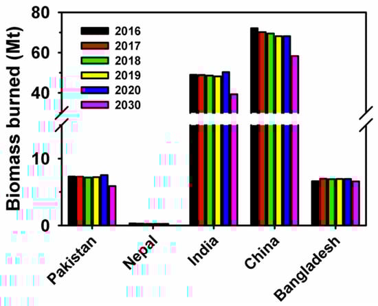 During the combustion of various materials, many effluents are dispersed in the environment, which can have an affect depending on the exposure duration, receptor susceptibility, and transmission process. These combustion effluents consist of solid gases, vapors, and liquid droplets with a particular size range. After cooling fire effluents, a chemical composition still exists where vapors form in submicron fields by condensation into liquid droplets and solid particles. Inhalation hazards during a fire by the occupants in remote areas are prevented when acid gases, organic particulates, and vapors are retained on building surfaces and elevated after fire risks []. The effluents are emitted into the air, water, and terrestrial environments. PAHs, hydrocarbons, VOCs, metals, dioxins, suspended solids, and ammonia are key concerning effluents produced during the firing process []. Burning stubble, such as sugarcane, can accumulate mercury in the soil and streams. Mercury can be toxic to humans and wildlife and cause developmental problems in fetuses. Stubble burning is the source of major gaseous pollutants, i.e., GHGS, NOx, SOx, and PM (PM10 and PM2.5), causing major human and environmental health issues. Approximately 63 Mt of crop stubble can emit CO (3.4 Mt), CO2 (91 Mt), CH4 (0.6 Mt), NOx (0.1 Mt), and PM (1.2 Mt) into the environment []. A recent study likely reported CO2 (176 teragrams (Tg)), CO (10 Tg), CH4 (314 gigagrams (Gg)), N2O (8.1 Gg), NH3 (151 Gg), non-methane volatile organic compounds (NMVOC, 814 Gg), PM2.5 (453 Gg), and PM10 (936 Gg) emissions from crop residue burning in northwestern India []. These stubble burning pollutants are transported from the Indian Punjab region to Pakistan, and vice versa. According to the air’s trajectory analysis, it was found that with compact bumps from the adjacent countries, transnational dispersal of pollutants exists across Bangladesh, India, Pakistan, and Nepal [,]. According to the world bank data, USD 8.1 trillion yearly is the cost of health damages originating by air pollution, which corresponds to 6.1% of the gross domestic product (GDP) globally []. In India, USD 28·8 billion of economic losses were recorded in 2019, and this cumulative deprivation of USD 36·8 billion was 1.36% of India’s GDP [].
