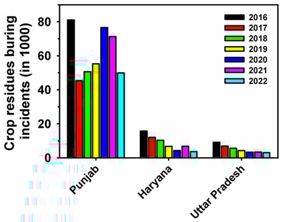 - Singh, D.; Dhiman, S.K.; Kumar, V.; Babu, R.; Shree, K.; Priyadarshani, A.; Singh, A.; Shakya, L.; Nautiyal, A.; Saluja, S. Crop residue burning and its relationship between health, agriculture value addition, and regional finance. Atmosphere 2022, 13, 1405. [Google Scholar] [CrossRef]