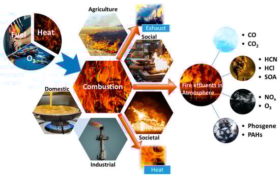 The planet has supported the production of ample oxygen and combustion fires since the time of adequate vegetation. Fire regimes are highly influenced by ecosystem composition, viz., fire frequency, spatial continuity, size, seasonality, types of fire (surface or ground fire, crown fire), fire severity, and intensity [,]. Industrial combustion, domestic combustion, societal combustion, agricultural combustion, and support services are the significant influencers of combustion due to human involvement with some risks and benefits []. The most tenacious combustion occurrence is smoldering combustion, as it is the most destructive fire process, which is a slow and low-temperature activity and a flameless burning process. Smoldering combustion is emerging as an industrial and environmental challenge; smoldering fires are a rising concern globally. During the smoldering process, sometimes, the flames’ disappearance follows a greater extension, devouring amounts of fuel and liberating toxic gases in the environment. Sturdy buoyant forces are involved in these kinds of fires, where firebrands initiated by bark and twigs are elevated and carried long distances (hundreds of meters) by the wind in downward directions, igniting several fire scenes []. There are research gaps in smoldering combustion, which can also be a beneficiary process for human beings. To have detailed knowledge, one can make use of recent reviews [,,,,]. Globally 26–29% of forest loss is because of forest fires during the 2001–2019 period, which is higher compared to the 2001–2015 (21–25%) and 2003–2014 (12–18%) periods. Due to fire incidents, boreal forests have a high segment of forest loss (69–73%), following subtropical (19–22%), temperate (17–21%), tropical (6–9%), and rainforests (7–9%). Australia has an increasing trend in forest loss in the tropical, subtropical, and temperate areas, and in Eurasia, boreal forests demonstrate a high loss proportion [,,]. In India, about 52,785 and 345,989 forest fires were analyzed from Nov 2020 to June 2021, i.e., the forest fire period, using a moderate resolution imaging spectroradiometer sensor and Suomi National Polar Orbiting Partnership Visible Infrared Imaging Radiometer suite. In Indian forests throughout the fire season, 54.4% see occasional fire, with 7.49% moderately frequent fires and 2.40% high incidence levels, and 35.71% remains non-exposed []. Recent fire events in Brazil, Australia, and California have again drawn full attention towards forest fires, chiefly the Amazonian fires, where whether forests or deforested areas were burning was not clear [,]. On the other hand, the waste and recycling industry is on the verge of providing energy, recycling, sorting, and yielding waste fires, which is an epidemic, as reviewed by Fogelman (2018). Germany, the UK, Sweden, Austria, and Italy are some of the major countries in Europe with the most incidents of waste fires [,]. However, major health risks were also observed with the waste fire incidents that have occurred in the cities of the USA and Thailand [,]. Stubble burning is the major contributor of air pollution by emissions of CH4 SOx, PM of 10 (PM10) and 2.5 (PM2.5) microns, nitrogen oxides (NOx), CO2, and CO in mostly South Asian countries such as India, Nepal, Bangladesh, and Pakistan and also in China (Figure 1). Globally, around one-fourth of biomass burning activities (household cooking, countryside communal refuse ignition, wildfires) are constituted by stubble burning regimes including forest fires comprehensively []. Due to changes in patterns of cropping and harvesting and water scarcity, agricultural fires are increasing in India []. Despite various interventions and the banning of these crop residue burning practices, this burning regime is still extensive. It has engendered about 44,000–98,000 deaths in 2003–2019, with the exposure of PM substances in the atmosphere where Haryana, Punjab, and Uttar Pradesh are the major contributors (Figure 2). India has a rich diversity of crops including rice, wheat, coarse cereals, pulses, oil seeds, sugarcane, cotton, jute and mesta, but rice and wheat, being rich producers, have a more diversified impact as their residues are burnt in large amounts for cropping processes. Sugarcane’s residues are also burnt in large amounts in India. About 6600 Mt of these crops residue were burnt during 2003–2016 []. There is a literature gap in studies of stubble burning and Diwali fireworks as these two events coincide with each other in India. Thus, the effect of the festival fireworks is somehow the same; stubble burning as SO2 and PM2.5 (900 μg/m3) are the major pollutants emitted during the fireworks process []. Combustion effluents are generated in response to the behavior of the burning process and product toxicity, which further resides in the fire plot (orientation and fuel’s shape), material composition, oxygen concentration, and temperature. These combustion effluents are gases, vapors, and liquids, and solid particles mix in varying ratios of combustion conditions to the material’s organic and elemental composition []. The effluents produced in the environment after burning the products are irritable and asphyxiant to humans. Asphyxiate gases, irritable gases, and complex molecules are some significant types of combustion effluents (Figure 3).