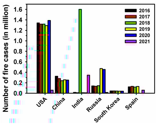 Recently, a report has been analyzed by the International Association of Fire and Rescue Services (CTIF) in which detailed information has been recorded for all the fire incidents which occurred globally from the year 1993 to 2020 []. In the present review, we have presented relative data for the fire occurrences throughout the years from 2016 to 2020 in various countries, chiefly, the USA, China, India, Russia, and Spain, and Republic of Korea (Figure 5), as these are the major countries for fuel and energy production. The fire outbreak scenario is 1388,500 (2021) > 454,206 (2020) > 345,989 (2021) > 252,000 (2020) > 129,544 (2019) > 38,659 (2020) for the USA, Russia, India, China, Spain, and Republic of Korea, respectively. Different types of fire were reported as follows: USA: 15% vehicles fire, 19.9% grass/brush fire, 16.2% rubbish, 13.4% others; Russia: 3.8% vehicles fire, 3.3% forest fire, 28.1% grass/brush fire, 26.9% rubbish, 5.2% others; Republic of Korea: 11.8% vehicles fire, 2.0% forest fire, 2.2% grass/brush fire, 7.6% rubbish, 11.9% others. The number of fire deaths were also analyzed in these countries based on year, inhabitants, and fire number, as summarized in (Table 2). In 2020, it is examined that around 24.2% of fires occurred in residential buildings and other fires were basically limited to forest, grass, and rubbish areas. In these fires, 61% are burn injuries and 82.5% of fire deaths have been registered.