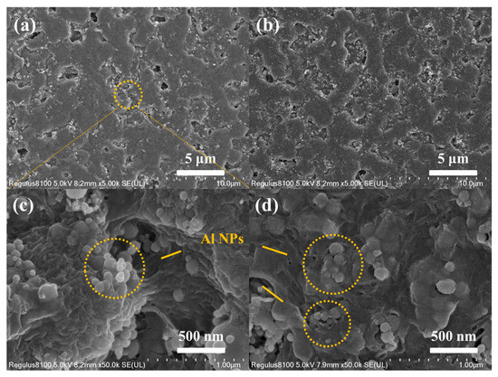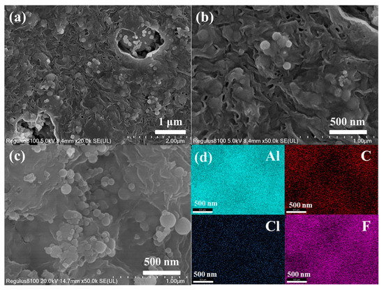 Figure 2 shows the SEM images of the original n-Al/PVDF system and the n-Al/PVDF system sample surface after adding an oxidant (ammonium perchlorate). As shown in Figure 2a,c, the surface of the pristine n-Al/PVDF sample is relatively smooth and dense, no large numbers of wrinkles are observed, and there are many protrusions and micropores [14,15]. The micropores may be formed by the solvent after evaporation. The Al NPs inside the sample are embedded in PVDF, and the interface between the two is relatively tight. Coating polymers to limit oxygen diffusion is considered an effective way to avoid further oxidation of reactive metals in air [14]. Therefore, the structure of Al NPs embedded in PVDF matrix is beneficial to the maintenance of the anti-aging ability of the system. As shown in Figure 2b,d and Figure 3a,b, with the addition of AP and KP, fine wrinkles began to appear on the sample surface. This is mainly due to the shape change caused by the crystallization of AP and KP when the solvent evaporates to form the sample. From the SEM characterization, it can be seen that, on the microscopic scale, the addition of AP and KP can directly affect the morphology of the APA(K) system through the crystallization process. Figure 3c,d show the distribution of Al, C, Cl and F elements in the samples. Among them, C and F elements represent PVDF, Al elements represent Al NPs and Cl elements represent AP. All elements are evenly distributed, indicating that these components are well dispersed in the sample.