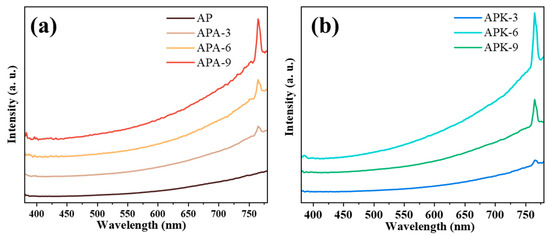 Flame emission spectrum analysis is an important method for analyzing the characteristics of the combustion process. The detected typical emission spectrum results are shown in Figure 5, and all samples exhibit typical blackbody radiation characteristics. The emission peak at ~760 nm is the atomic emission peak of the K element [36,37]. In the study of combustion emission characteristics of energetic substances, even if there is no K element in the system, the emission peak of impurity K atoms is often unavoidably detected [36,37]. In the n-Al/PVDF system with KP added, the emission peak of K atoms comes from the decomposition of potassium perchlorate in the combustion process. For the n-Al/PVDF system with AP added, the emission peak of K atoms also comes from the K impurity in the system. With the increase in AP/KP content, the emission peak of K atoms is also enhanced.