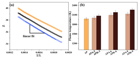 For n-Al-based energetic materials, the temperature is usually calculated by assuming a functional dependence of the emissivity (ε ∼ λ−1 and independent of temperature) during the calculation, as shown in Equation (2). Equation (3) is obtained by taking the natural logarithm on both sides of Equation (1). The quantity Z is defined by Equation (4). The temperature is then determined from the slope, using a plot of Z versus the reciprocal wavelength, as shown in Figure 6a.