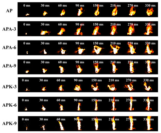 When the nickel-chromium wire igniter is used to test the ignition performance, the input energy is provided by a constant current source. Ink samples were printed on Ni-Cr bridges, about 50 mg per sample. Among the samples investigated here, all the samples could be successfully ignited by the Ni-Cr wire igniter with a bright flame, as shown in Figure 7. The nickel-chromium bridge wire on the Ni-Cr igniter melts under the heat of the current, thereby transferring heat to the energetic system along the nickel-chromium wire. Similar to the phenomenon seen in Section 3.2, the center part of the flame of the pure n-Al/PVDF system is bright white, and the edge is dark orange–yellow. As shown in Figure 7, the burning flame of AP is orange–yellow as a whole, and the bright white part in the center is relatively small. Moreover, when the addition of perchlorate reached 6% or 9% (APA-6, APA-9, APK-6 and APK-9), the flame shows a large bright-white area. This indicates that the addition of AP/KP changes the radiation characteristics of the flame and increases the flame temperature, as described in Section 3.3.