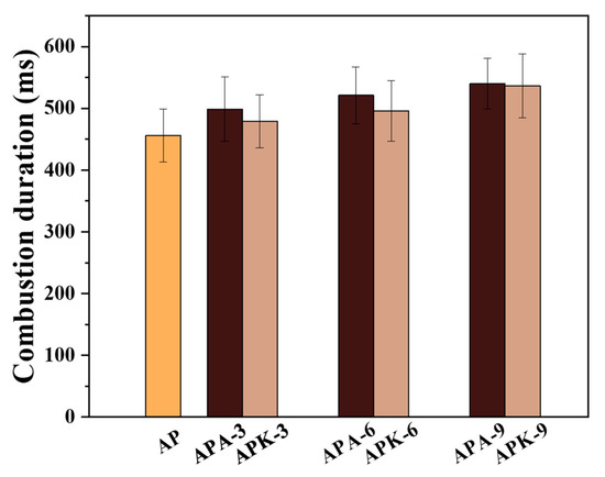 Figure 8 shows the continuous burning time of each sample on the Ni-Cr igniter. When the AP content in the system increased to 9%, the burning time increased from 456 ± 43 ms to 498 ± 52 ms, 521 ± 46 ms and 539 ± 41 ms. When the KP content increased to 9%, the flame duration of the n-Al/PVDF system increased from 456 ± 43 ms to 478 ± 42 ms, 496 ± 49 ms and 536 ± 52 ms. The prolongation of the flame duration on the Ni-Cr igniter may be due to the fact that the reaction rate of the system is determined by the Al-F reaction, and the reaction between perchlorate and Al occurs behind the flame front. Therefore, the addition of perchlorate prolongs the burning time of the flame. This shows that the addition of perchlorate can effectively improve the energy output of the n-Al/PVDF system.