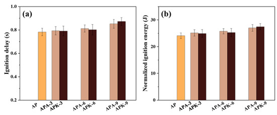 The ignition energy is calculated by the formula , where U is the voltage, I is the current and t is the ignition delay time. Since a large part of the input energy is used to heat the nickel-chromium wire, it will not be transferred to the sample. Therefore, the normalized ignition energy was used as a scalar in this study. Figure 9 shows the ignition delay versus normalized ignition energy for each sample. In the Al/PVDF system, with the addition of perchlorate, the ignition delay and normalized ignition energy were both significantly increased. The maximum value was reached at 9% perchlorate addition, increasing from 0.782 ± 0.032 s and 24.08 ± 1.06 J for AP to 0.852 ± 0.038 and 27.01 ± 1.25 (APA-9), and 0.872 ± 0.033 and 27.46 ± 1.51 (APK-9). This shows that the addition of perchlorate will increase the ignition threshold of the Al/PVDF system. This is consistent with the conclusion reached in Section 3.2, that is, that the energy output rate of the Al/PVDF system is dominated by the Al-F reaction. Since fluorine has a higher electronegativity than O, a large number of researchers have found that PVDF can undergo a pre-ignition reaction with Al before the ignition temperature to improve the ignition performance of the system. It is therefore speculated that the addition of perchlorate weakens the Al-F reaction process when the system is ignited. Thus, the addition of perchlorate will increase the ignition threshold of the Al/PVDF system.