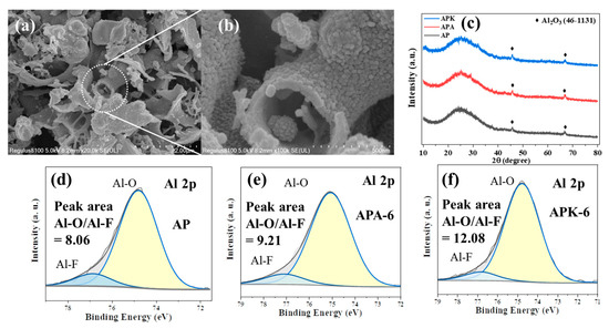 Figure 10a,b show the SEM images of the combustion products of the n-Al/PVDF system. The combustion products are mainly convoluted layered carbon, inlaid with granular products of aluminum combustion. Figure 10c shows the XRD images of the combustion products of the n-Al/PVDF system before and after adding oxidants. Among them, the diffraction peaks of 45.7° and 66.9° belong to Al2O3 (JCPDs No.46-1131). The results of Al 2p fine spectrum by XPS show that Al-O (74.6 eV) and Al-F (76.6 eV) exist in each sample, as shown in Figure 10d–f. The difference is that the peak area ratio of Al-O relative to Al-F increases after adding oxidants. As shown in Figure 10d–f, the peak area ratio of Al-O/Al-F in the AP system is 8.06, while the peak area ratios of Al-O/Al-F in the APA-6 and APK-6 systems are 9.21 and 12.08. This indicates that the addition of perchlorate can enhance the Al-O reaction in the n-Al/PVDF system. This also partly justifies the reasons for the changes in the experimental phenomena described in the previous sections, including the flame radiation characteristics, flame temperature and energy release rate.