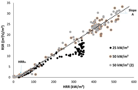 From the linear part of the curve RSR = f(HRR), two parameters can be calculated. The first one is called A (m2/kJ) and represents the increase in RSR per HRR unit. The second one is called HRRth, i.e., HRR threshold, and represents the minimum value of HRR for which RSR starts to increase. RSR is defined from HRR using Equation (3).