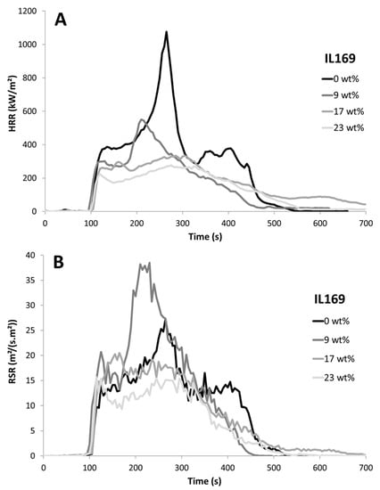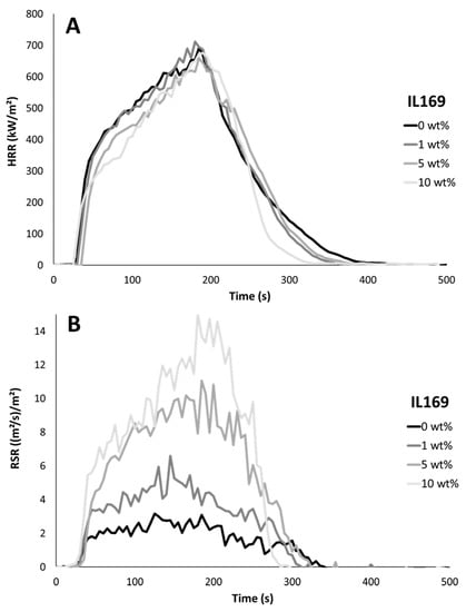 (A)/HRR versus time in cone calorimeter (50 kW/m2) for Elium resin filled with various contents of IL169. (B)/RSR versus time in cone calorimeter (50 kW/m2) for Elium resin filled with various contents of IL169.