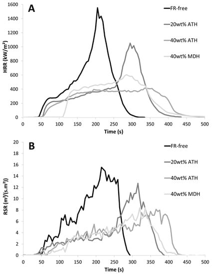 Formulations based on PE/EVA (series D) and ABS (series E) were also tested (Figure 5 and Figure 6). Their fire properties (PCFC, cone calorimeter and LOI) can be found elsewhere []. Figure 5 shows HRR and RSR curves for some PE/EVA composites. It can be found that the incorporation of fillers decreases both heat release and smoke production. The decrease seems to be proportional to the filler content and more or less similar for HRR and RSR. ATH is more effective than MDH at the same content. For 60 wt% of FR (ATH, MDH or a blend of both fillers), the smoke production becomes very low and intrinsic smoke properties cannot be properly calculated. The ranking between the formulations is the same in terms of HRR and RSR.