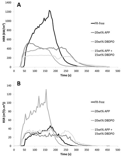 Some curves are plotted in Figure 6 for series E. Contrarily to previous results, a strong discrepancy is observed between HRR and RSR curves. Especially, 20 wt% DBDPO efficiently reduces HRR but leads to a huge increase in RSR. A total of 20 wt% APP allows the reduction of RSR (in comparison to pure ABS) but at a much lower extent than HRR. Among the curves shown in Figure 6, the combination of 15 wt% APP + 15 wt% DBDPO is the most efficient to reduce the HRR but releases more smoke than 20 wt% APP. It is noteworthy that the HRR and RSR curves for the combination of both fillers is closer to the curves for 20 wt% APP than the curves for 20 wt% DBDPO.