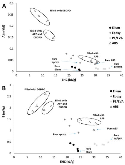 Figure 7A,B shows the A and B values versus the effective heat of combustion for all these formulations. In many cases, for the same class of materials, it can be found that A and B values increase when the effective heat of combustion decreases. Nevertheless, depending on the polymer and FR, huge differences are observed.