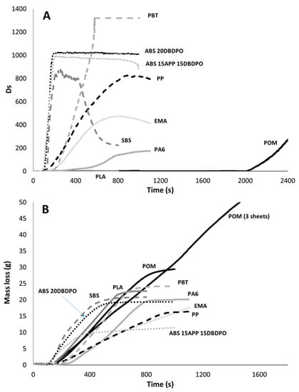 In many articles, the mass loss rate is not considered and only the smoke density is provided. Several curves Ds = f(time) and MLR = f(time) are shown in Figure 8. It is noteworthy that some polymers do not produce smoke (Ds ≈ 0). These polymers (POM and PLA) are those for which the smoke in the cone calorimeter is also null. When three sheets of POM are tested (total mass = 96 g), Ds starts increasing after flaming out. At this time, the remaining mass is 30 g. In other words, the mass loss was 66 g. Since the heat of combustion of POM is 14 kJ/g, 2.23 mol of O2 has been consumed at flame out. It represents almost 50% of the oxygen present in the smoke chamber (considering that air contains 20 wt% of oxygen). It is by far the highest oxygen consumption in our experiments. Of course, this is a rough overestimation, while the effective heat of combustion is not known and may be lower. PA6 produces a moderate amount of smoke (Ds reaches around 180). Other materials produce much more smoke and the maximum Ds is in the range of 470–1320.
