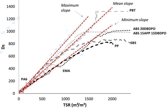 Figure A1 shows the change in calculated Ds when MLRth changes from 2.84 g/(s.m2) (the value calculated from data in Sonnier et al. []) to 0 (i.e., without HRR or MLR threshold, as usually observed for aromatic-based polymers). The influence of the choice of MLRth is significant, considering MLRth = 0 leads to non-negligible uncertainties. Nevertheless, for most of the polymers, the value of MLRth is much lower.