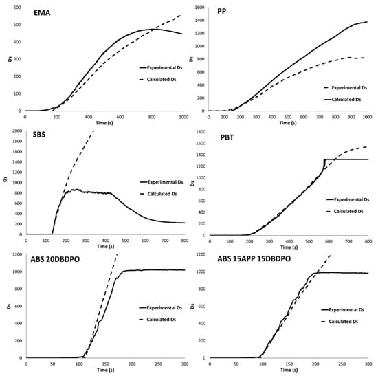 Figure 10 shows the experimental curves Ds = f(time) together with the calculated ones using Equations (7) and (8) for the seven materials producing the most amount of smoke. A remarkable agreement can be observed for most materials. The fit is less satisfactory for PP and EMA. The calculated Ds at 500 s is 657 and 279, respectively (versus 518 and 339 for experimental Ds).