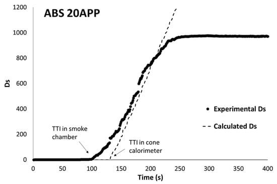 In the previous section, the prediction of Ds still needs the knowledge of TTI and mass loss rate in the smoke chamber. ABS filled with 20 wt% of APP was also tested at 25 kW/m2 in the cone calorimeter. The smoke production in the smoke chamber was calculated using the mass loss rate curve obtained in the cone calorimeter and the smoke properties listed in Table 1 (previously calculated using cone calorimeter data at 50 kW/m2).