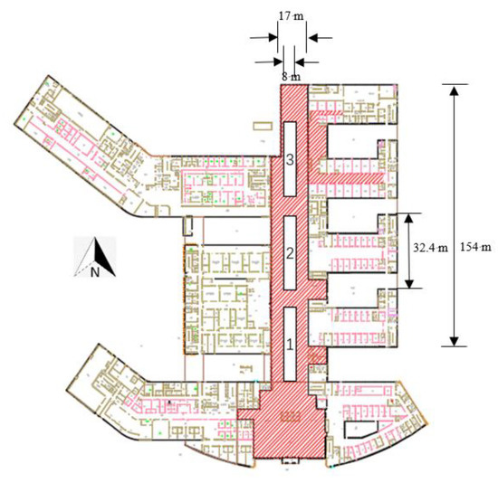 The experimental area was located in a pedestrian street and adjacent ring corridor in a building complex in Fuzhou, as shown in Figure 1. The building has 4 floors, each with a floor height of 4.5 m, and the pedestrian street is a narrow and straight, 154 m long and 17 m wide. Corridors on both sides are 4 m wide with a height of 2.8 m under the ceiling. The pedestrian street contains three atriums 1#, 2# and 3#. All three atriums are 19.8 m high. The experimental location is Atrium 2#, which is 32.4 m long and 8 m wide. The doors and windows on both sides of the ring corridor were kept closed during the experiment. The smoke exhaust system was opened according to different working conditions of the experiment, and the volume of the top smoke exhaust fan was 64,200 m3/h.