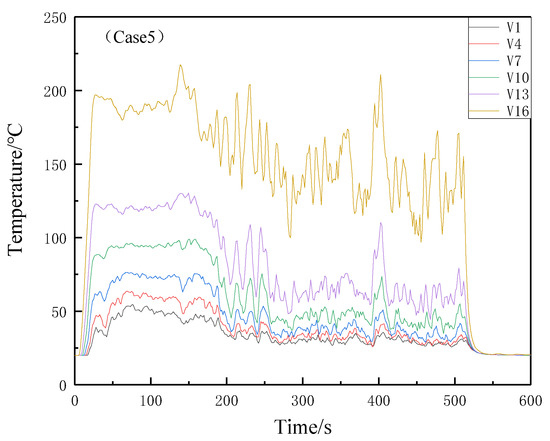 The fire produces a large amount of smoke, and releases huge heat to produce a high temperature. A high temperature environment and toxic smoke will bring difficulties to the safe evacuation of trapped people. Long-term exposure to smoke will seriously damage people’s physical functions, and they may lose the ability to escape. The study of the temperature distribution law of smoke in an atrium can not only provide a reference for building fire design, but also provide guidance for personnel evacuation during a fire. Figure 7, Figure 8, Figure 9, Figure 10 and Figure 11 are the variation charts of vertical smoke temperature in the atrium under five different working conditions, and six measurement points at different positions are selected as analysis objects in the vertical direction: V1 (17.3 m), V4 (14.3 m), V7 (11.3 m), V10 (8.3 m), V13 (5.3 m), V16 (2.3 m).