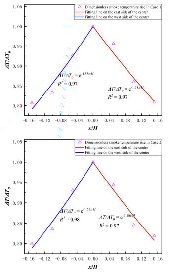 where represents the temperature of the measurement point in the ‘x’ direction, °C; represents the temperature at the center position directly above the fire source, °C; is the attenuation coefficient of dimensionless smoke temperature rise with dimensionless distance from fire source; x is the distance from the center point, m; H is the clear height of atrium, 19.8 m.