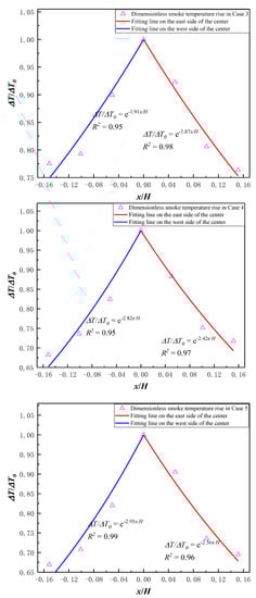 It can be seen from Figure 15 that the variation of lateral dimensionless smoke temperature rise under the atrium ceiling with the distance between dimensionless and fire source has a greater relationship with the heat release rate. The larger the heat release rate is, the higher the smoke temperature in the atrium is, and the greater the mass flow rate is, also the faster the smoke spreads, resulting in a smaller attenuation coefficient. The smoke temperature shows a trend of attenuation from the central position to both sides, and the left and right sides are basically symmetrically distributed, but there are still slight differences. Possibly because the east side of the building has a protruding space, as well as the obstruction of the smoke barrier, the east side of the smoke accumulates in a small area, and the heat is not dispersed, resulting in a smaller attenuation rate than the west side. Analyzing the influence of different experimental scenarios, it is found that the dimensionless temperature rise attenuation rate is also related to the use of the smoke exhaust system. Specifically, after opening the natural smoke exhaust vents (Cases 1 and 2) and turning on the mechanical smoke exhaust (Cases 4 and 5), the smoke flow is accelerated, and the heat exchange with the external environment is promoted, bringing the cooling effect to the smoke. Therefore, it will lead to the increase of the attenuation coefficient, which means that the attenuation rate also increases. Additionally, the effect of mechanical smoke exhaust is better than that of natural smoke exhaust.