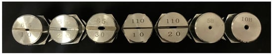(3) Liquid nitrogen nozzle selection. Liquid injected from different nozzles produce different atomization areas, which will have a certain influence on liquid nitrogen cooling and fire extinguishing. In this test, quarter sector fan-shaped spray nozzles (6510#, 6520#, 6530#, 11010#, 11020#) and quarter solid conical spray nozzles (5B#, 10B#) are chosen. The physical picture and parameters are shown in Figure 2, Table 1 and Table 2.