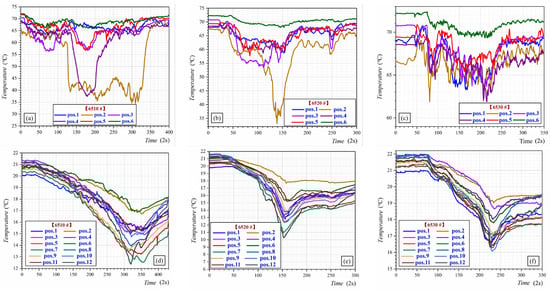 Temperature variations of different monitoring points after liquid nitrogen injection by 65 series nozzles: (a) Temperature variations on the heating sheets for 6510#; (b) Temperature variations on the heating sheets for 6520#; (c) Temperature variations on the heating sheets for 6530#; (d) Temperature variations on the side of the container for 6510#; (e) Temperature variations on the side of the container for 6520#; (f) Temperature variations on the side of the container for 6530#.