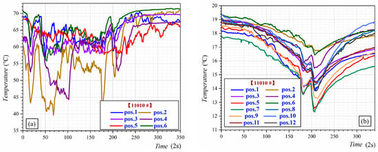 As shown in Figure 5, the temperature at the monitoring positions 2 and 4 of the heating sheets on the boxes fluctuates greatly and drops in a very short time when the 11010# nozzle is used, indicating the significant cooling effect. When 11020# nozzle is used, the temperature at position 5 fluctuates obviously, and the lowest temperature reaches 32 °C. For the monitoring points on the side of container, the temperature change at position 7 is the largest, and at position 2 is the smallest when 11010# nozzle is used, with the lowest temperature reaching 12.2 °C. When using the 11020# nozzle, the temperature changes little in the initial stage, but the temperature of each position of drops to the lowest point in a short time. In comparison, it can be seen that the maximum temperature drop of each monitoring point for 11010# nozzle is larger than that of 11020# nozzle.
