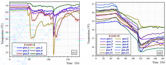 Temperature variation of different monitoring points after liquid nitrogen injection by 110 series nozzles: (a) Temperature variations on the heating sheets for 11010#; (b) Temperature variations on the side of the container for 11010#; (c) Temperature variations on the heating sheets for 11020#; (d) Temperature variations on the side of the container for 11020#.