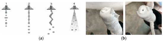 Liquid nitrogen ejection from solid conical spray nozzles: (a) Different patterns for atomization of solid nozzles; (b) Frosting phenomenon at the outlet of nozzles.