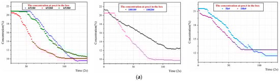 Moreover, the comparison of Figure 7a,b shows that for the same monitoring points, the difference in the final oxygen concentration is smallest when using the 65 series of nozzles, and the difference is biggest when using the 110 series nozzles.