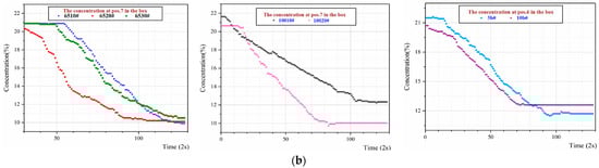 Variations of Oxygen concentration in the test container for different nozzles: (a) Variations of oxygen concentration with time at position 6; (b) Variations of oxygen concentration with time at position 7.