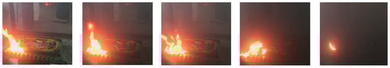 The main combustible materials of uninterruptible power supply (UPS) are battery electrolytic solution, circuit board and its surface combustible materials. The combination of the UPS circuit board and switch transformer are used in the test, as shown in Figure 10. The test process of UPS combustion is similar to that of optical fiber combustion. It can be seen in Figure 11 that the whole combustion process presents a small fire. Compared with optical fiber combustion, the ignition point range of the uninterruptible power supply combination fire is smaller. Although liquid nitrogen is injected at a low flow rate, the fire is successfully extinguished within 2 min. It indicates that liquid nitrogen has obvious extinguishing effect on the combustion of uninterruptible power supply combination.