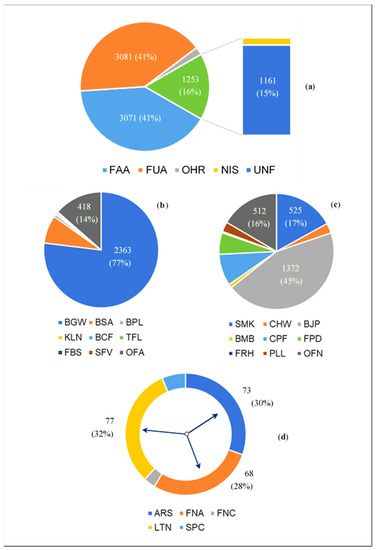 Averaged fire number distribution in terms of fire causes throughout the years studied: (a) among FAA, FUA, OHR, NIS and UNF, (b) within the fire causes of FAA, (c) within FUA and (d) from both OHR and NIS.