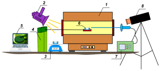 Scheme of the setup for studying the thermal decomposition of gas hydrate on radiant heating: 1—muffle furnace; 2—spotlight; 3—electronic balance; 4—positioning mechanism; 5—laptop; 6—metal holder with a hydrate tablet; 7—gas analyzer; 8—camera.