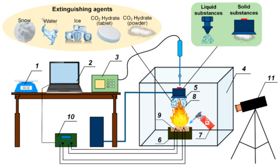 Scheme of the setup for studying the fire containment and suppression: 1—electronic balance; 2—laptop; 3—gas analyzer; 4—transparent cube; 5—extinguishing agent feeder; 6—container with burning material (wood/linoleum/cardboard); 7—gas burner; 8—extinguishing agent; 9—thermocouple; 10—temperature transmitter; 11—camera.